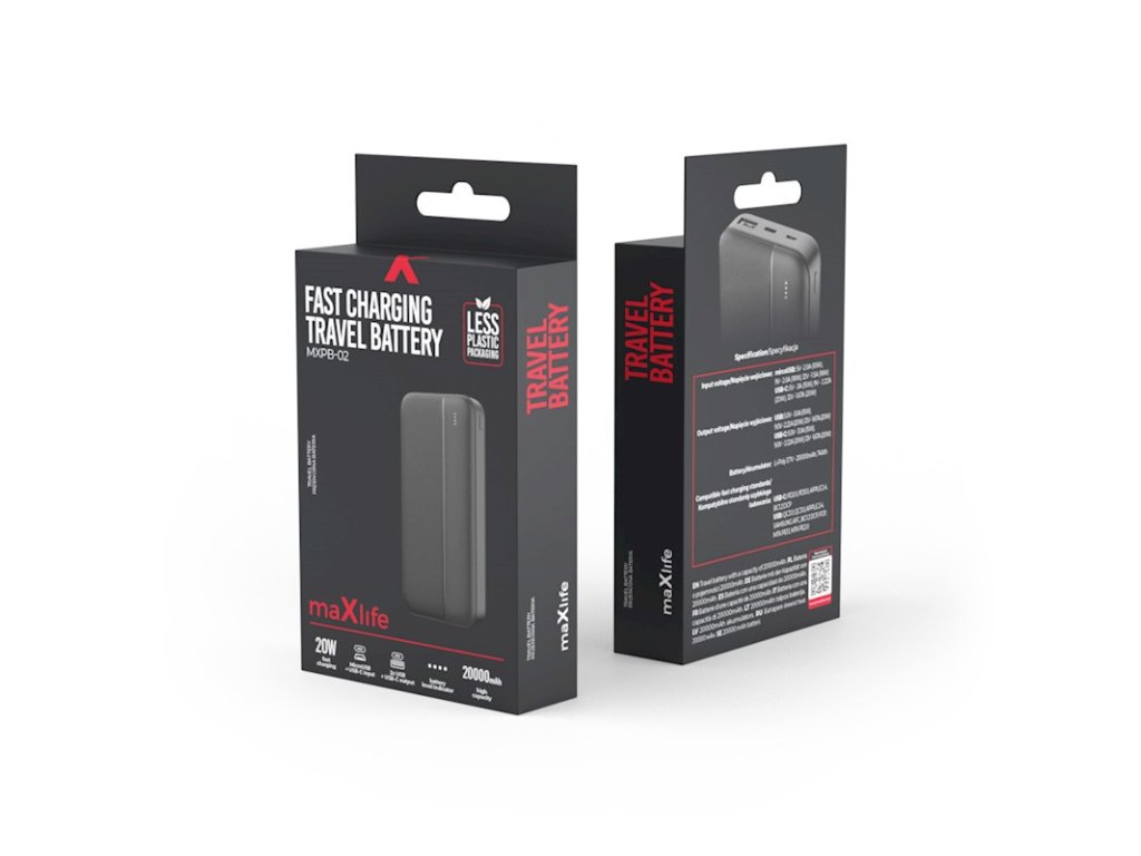 MXPB-02 od Maxlife je powerbanka, ktorej kapacita zaručuje nabíjanie na mnoho hodín s výkonom 20 W. Výstupné porty umožňujú pripojiť viacero zariadení súčasne. Powerbanka sa nabíja rýchlejšie vďaka technológii Power Delivery a Quick Charge.